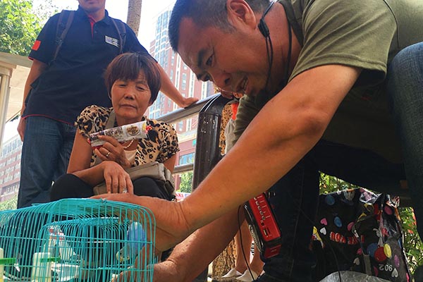 男子向路人介紹鸚鵡算命的“神奇”之處