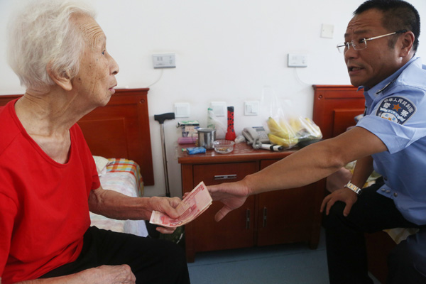 張?zhí)熘医o老人留下500元零用錢(qián),老人不要,二人推來(lái)推去