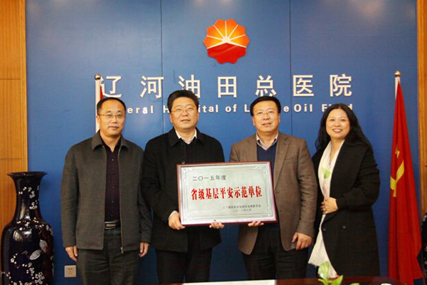 遼河油田政法委常務(wù)副書記藍(lán)子天(右二)為總醫(yī)院頒發(fā)牌匾