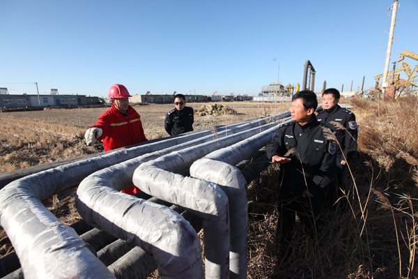 歡喜嶺采油廠保衛(wèi)科人員在查看井場油氣管線