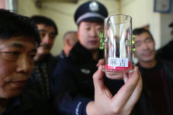 12月12日,東港市公安局長山派出所民警帶著收繳的麻古丸、冰毒、K粉等毒品實物,來到轄區(qū)村屯群眾密集場所,開展關于毒品危害的宣傳活動。