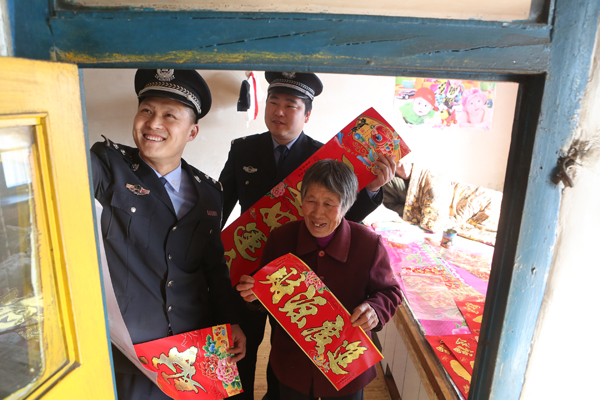 2017年1月24日,民警在幫鄒正榮老人貼春聯(lián)