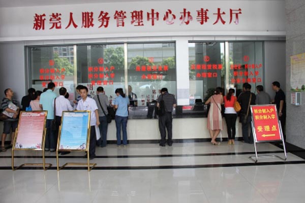 異地務(wù)工人員在辦事大廳辦理積分入戶、積分入學(xué)等事項(xiàng)