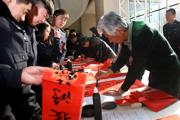 為活躍警營文化生活,深入推進(jìn)萬名民警“走基層、聯(lián)萬家”愛民主題實(shí)踐活動(dòng),1月23日,沈陽市公安局舉辦“聯(lián)萬家”迎新春主題楹聯(lián)展活動(dòng)。朱成國、盧林、歐陽明利等著名書法藝術(shù)家專程趕到現(xiàn)場,揮毫潑墨,為廣大民警書寫春聯(lián),用手中的筆,將墨跡凝結(jié)成一份份祝福,表達(dá)了書法藝術(shù)家和公安機(jī)關(guān)之間的魚水深情。