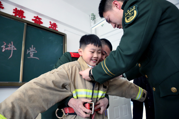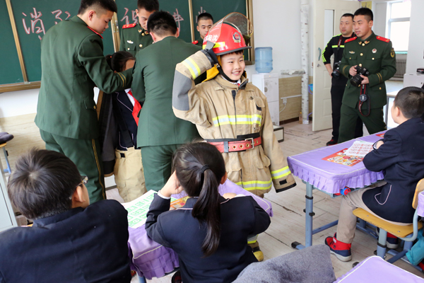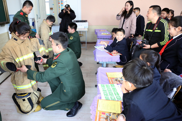 消防官兵與孩子們互動(dòng),為小朋友試穿消防服