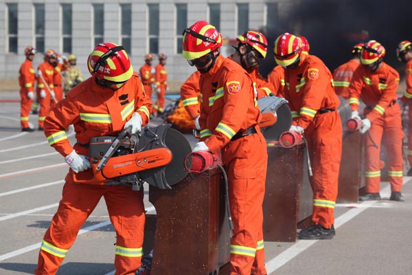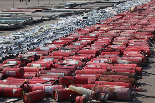 消防隊員用切割器對假冒偽劣滅火器進行切割銷毀
