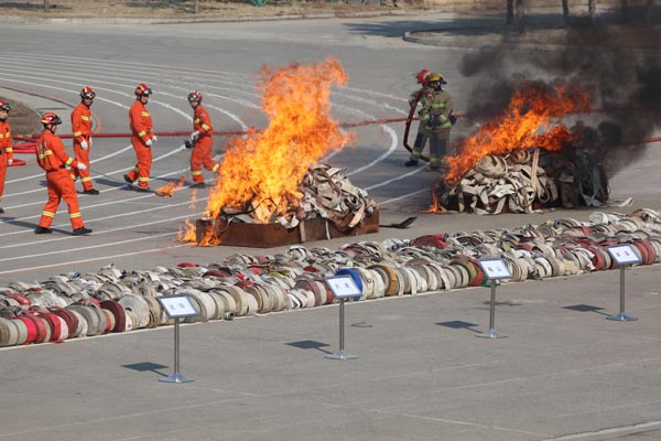 消防隊員對假冒偽劣的消防水帶進行焚燒銷毀