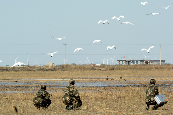 日前,遼寧公安邊防總隊凌海市邊防大隊西八千公安邊防派出所不斷加大野生 動植物保護力度,組織干警成立護鳥小分隊進行巡護,為來白天鵝遷徙中轉(zhuǎn)站歇息的白天鵝保駕護航,確保白天鵝與其它遷息候鳥在此安全覓食與棲息。