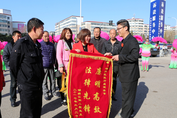 3月21日,阜新市海州區(qū)人民法院的大門(mén)口喧天鑼鼓伴隨著秧歌隊(duì)歡快的舞步,吸引了往來(lái)的車輛慢行和行人的駐足。該市某小區(qū)240戶業(yè)主的9名代表向執(zhí)勤法警說(shuō)明,他們是來(lái)感謝海州區(qū)法院民事審判一庭的法官成健的,其中小區(qū)業(yè)委會(huì)副主任手里拿著一面上書(shū)“‘廉明高效 法律先鋒’贈(zèng)海州區(qū)法院民一庭成健法官”的錦旗。