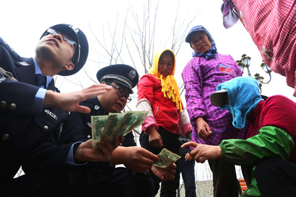 日前,東港市公安局十字街派出所開展識別假幣宣傳活動,民警進村屯通過讓群眾辨認假幣,教辨認假幣基本知識,增強廣大群眾的防騙意識。