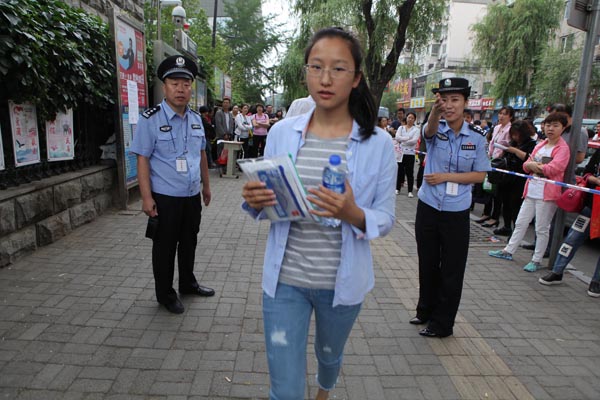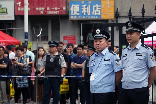 在沈陽市第四中學(xué)考點(diǎn),民警和學(xué)校安保人員一起執(zhí)勤護(hù)衛(wèi),確??键c(diǎn)秩序正常