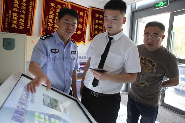 民警在指導(dǎo)軟件園企業(yè)員工如何正確使用交通違法查詢機(jī)
