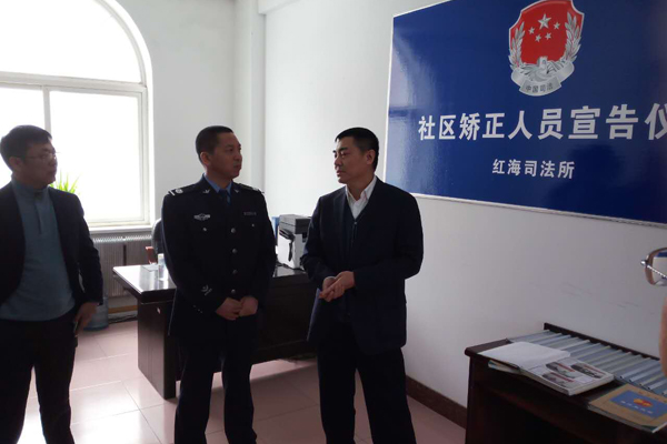 \\閆叢軍(中)向營(yíng)口市司法局局長(zhǎng)王進(jìn)(右)匯報(bào)社區(qū)矯正工作