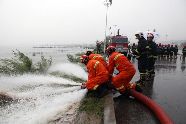 7月18日,在沈陽市棋盤山秀湖水域,沈陽市公安消防支隊組織官兵為遠程供水車鋪設水帶,這是針對近期汛期到來,沈陽市公安消防支隊在全市范圍內相繼開展的防汛救援演練的一項重要活動之一,有效地提高了消防官兵防汛救災的作戰(zhàn)能力。