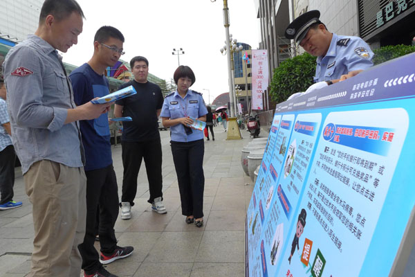 民警在商業(yè)區(qū)進(jìn)行預(yù)防電信詐騙宣傳