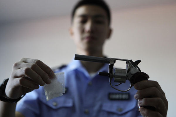 9月19日,沈陽市公安局鐵西分局刑偵禁毒大隊民警正在展示繳獲的毒品及槍支。當天,鐵西分局宣布,該局成功打掉一個販賣毒品和非法販賣、持有槍支的犯罪團伙,破獲涉毒案件11起、非法販賣和持有槍支案件3起。