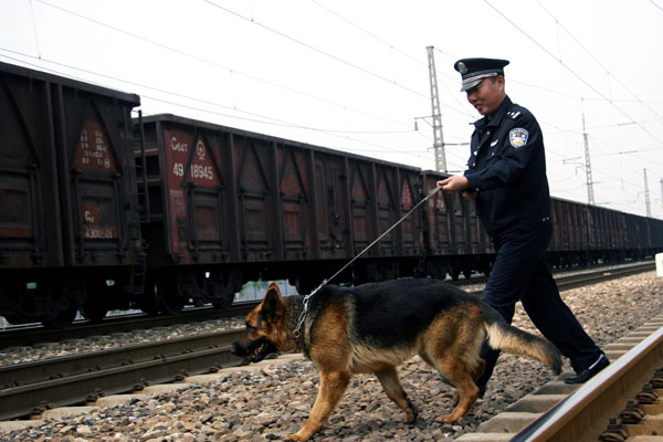 9月20日,沈陽(yáng)鐵路公安處沈陽(yáng)站民警攜警犬在轄區(qū)鐵路線路巡查護(hù)路